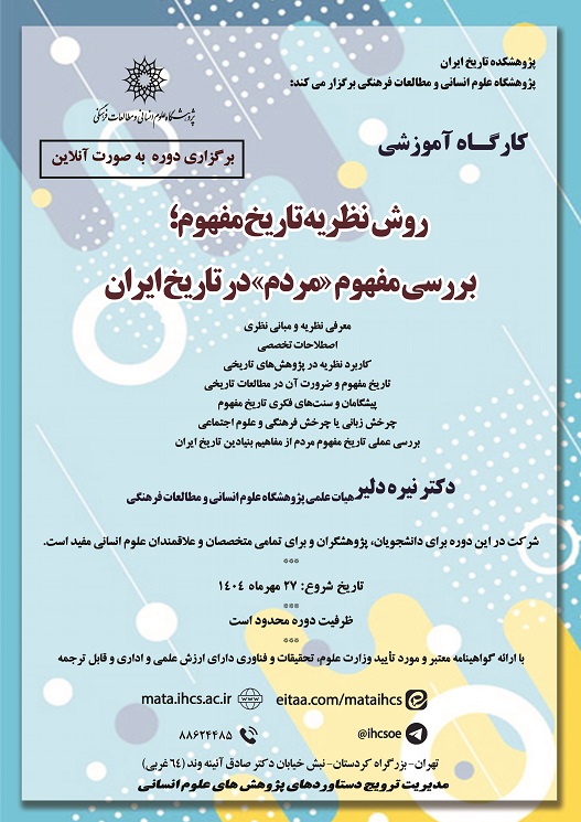 دوره آموزشی « کارگاه روش – نظریه تاریخ مفهوم؛ بررسی مفهوم «مردم» در تاریخ ایران» توسط پژوهشکده تاریخ ایران پژوهشگاه علوم انسانی و مطالعات فرهنگی در تاریخ 27 مهرماه 1404 بصورت مجازی شروع میشود.