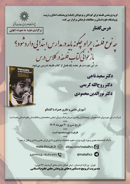 دوره آموزشی « درسگفتار آموزشی فلسفه: چه نوع فلسفه، چرا و چگونه باید در مدارس ابتدایی وارد شود؟ بازخوانی کتاب فلسفه در کلاس درس» توسط گروه پژوهشی فلسفه برای کودکان و نوجوانان (فبک) پژوهشکده اخلاق و تربیت پژوهشگاه علوم انسانی و مطالعات فرهنگی از تاریخ 9 شهریورماه 1404 بصورت مجازی شروع میشود.