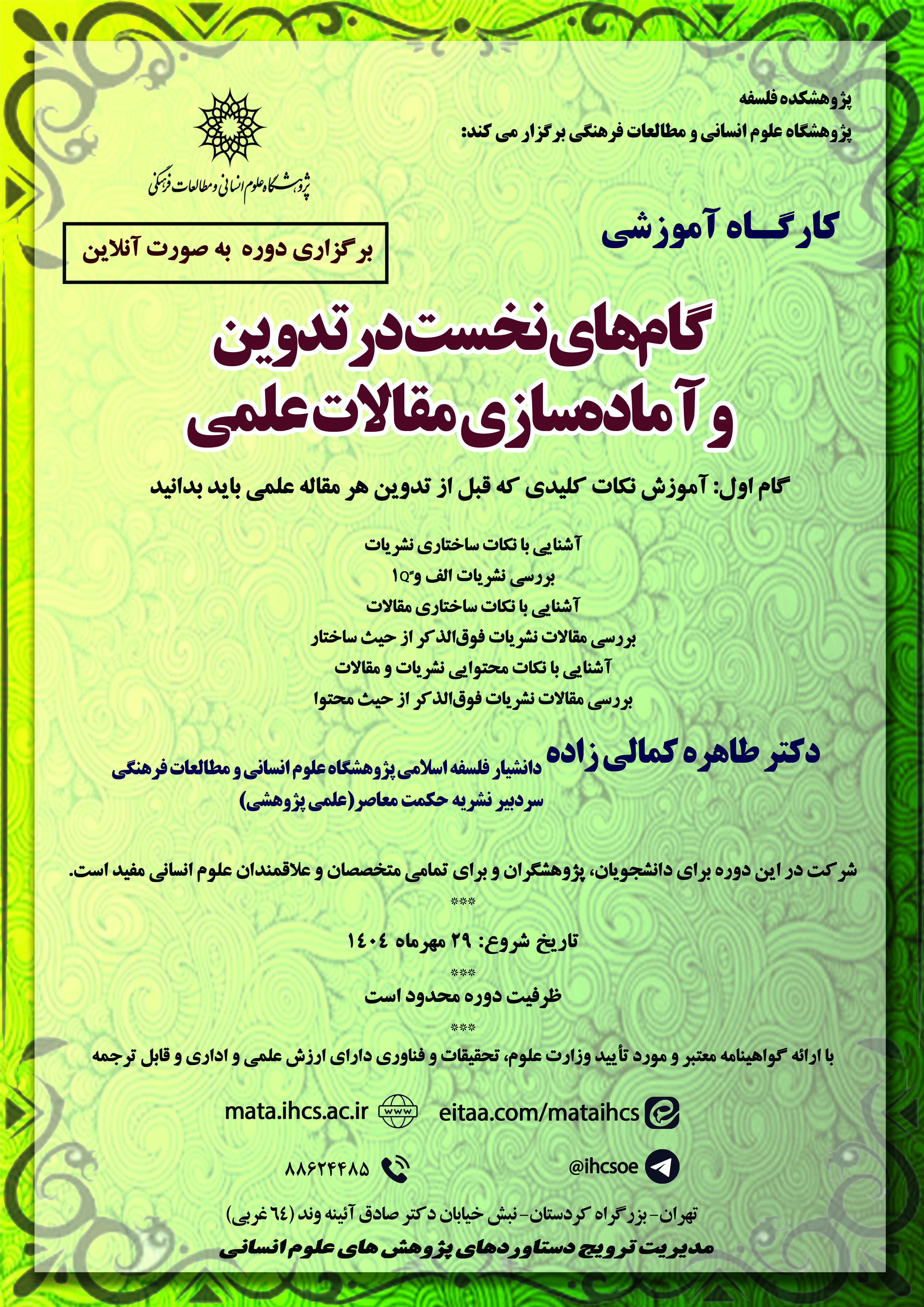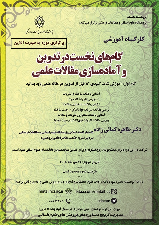 )دوره آموزشی «کارگاه گامهای نخست در تدوین و آمادهسازی مقالات علمی؛ گام اول: آموزش نکات کلیدی که قبل از تدوین هر مقاله علمی باید بدانید» توسط پژوهشکده فلسفه پژوهشگاه علوم انسانی و مطالعات فرهنگی از تاریخ 29مهرماه 1404 بصورت مجازی شروع میشود.