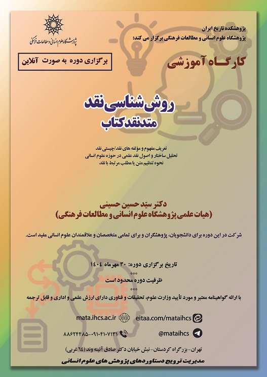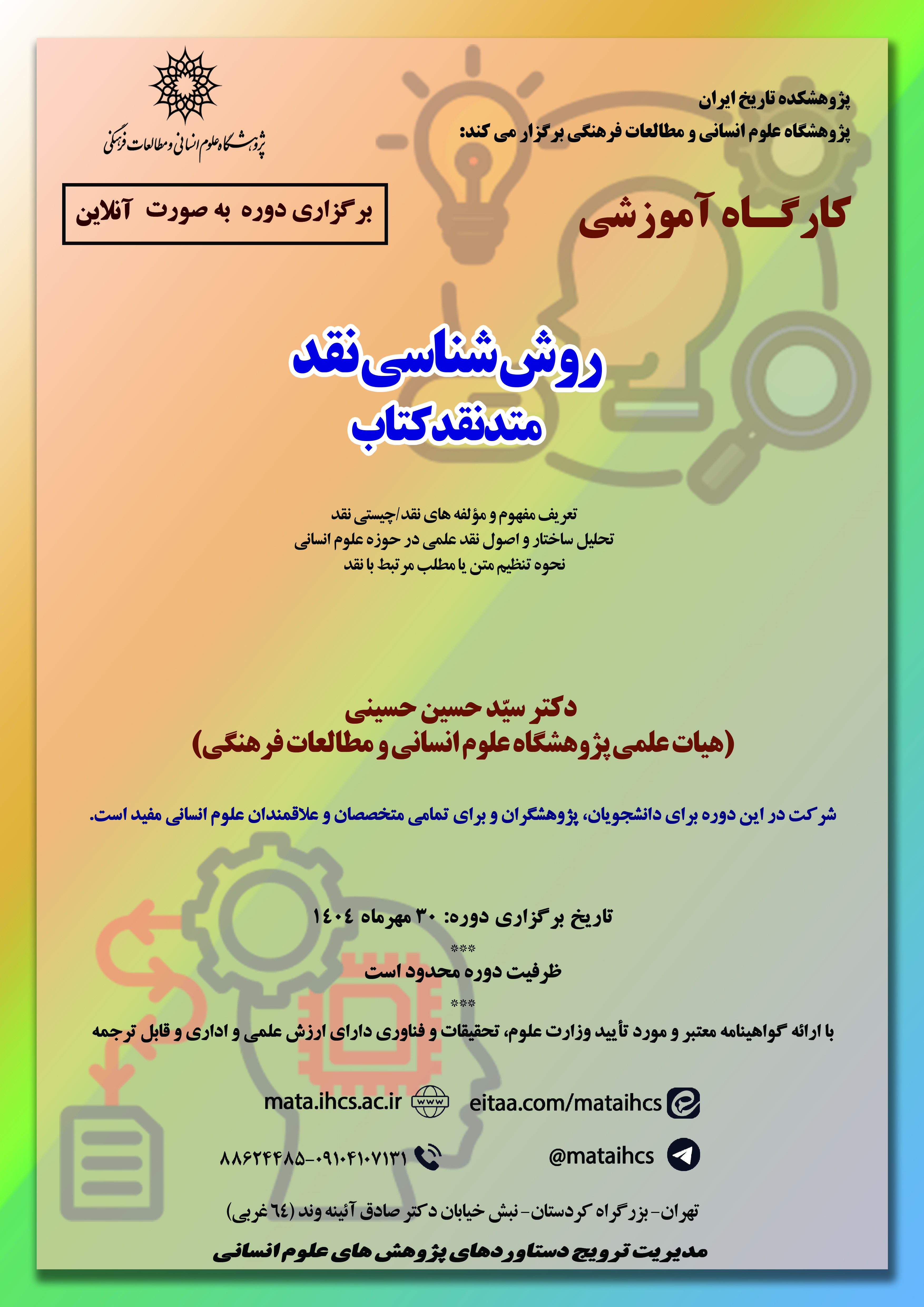 دوره آموزشی «کارگاه روش شناسی نقد متد نقد کتاب » توسط پژوهشکده تاریخ ایران پژوهشگاه علوم انسانی و مطالعات فرهنگی از تاریخ 30 مهرماه 1404 بصورت مجازی شروع میشود.