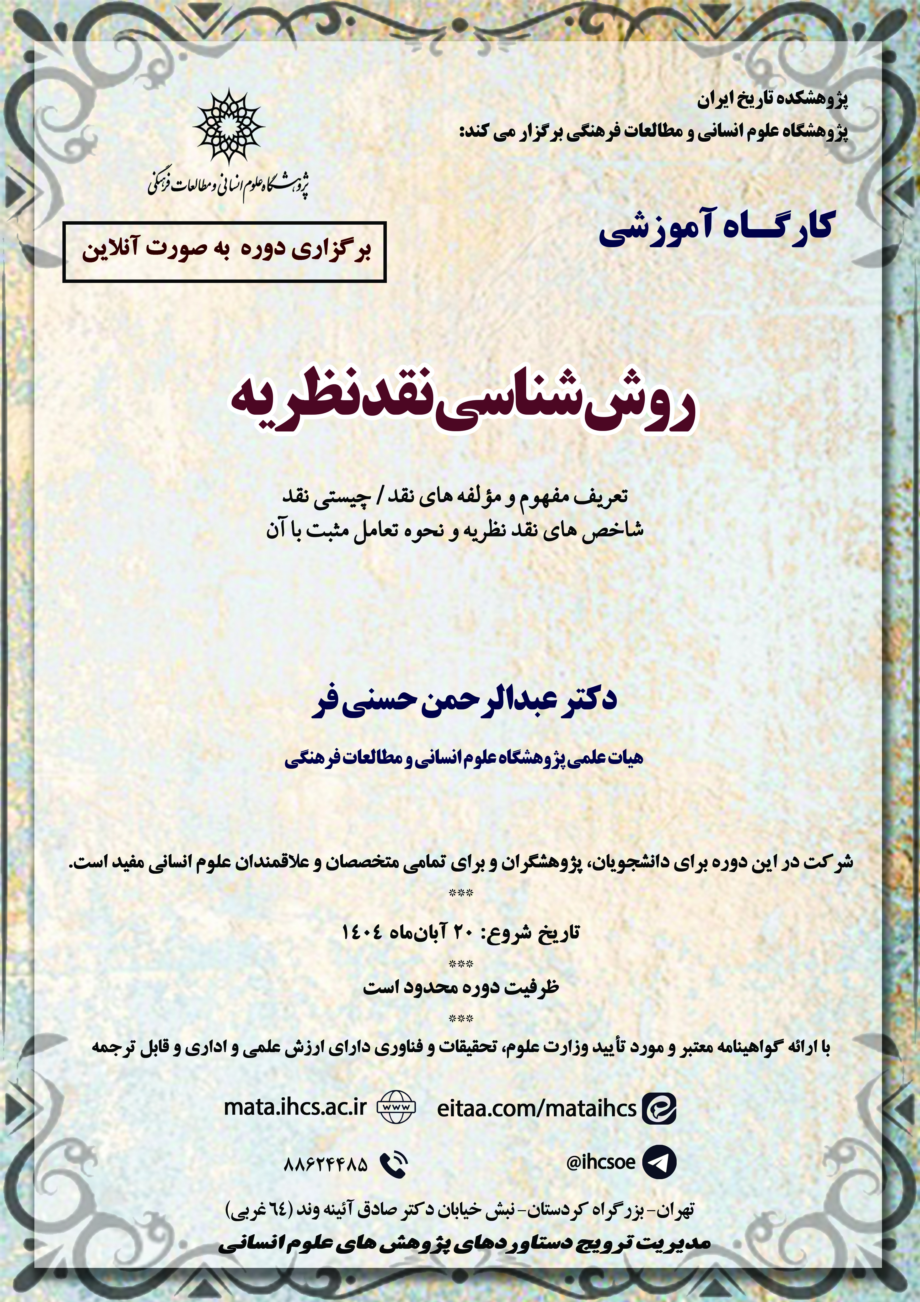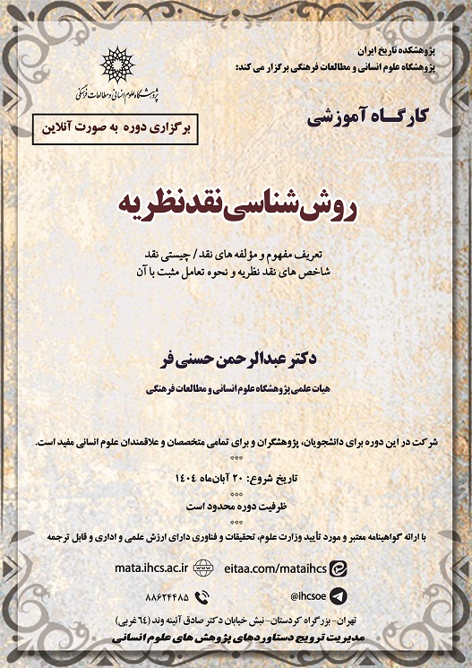 دوره آموزشی «کارگاه روش شناسی نقد نظریه» توسط پژوهشکده تاریخ ایران پژوهشگاه علوم انسانی و مطالعات فرهنگی از تاریخ 20 و27 آبانماه 1404 بصورت مجازی شروع میشود.