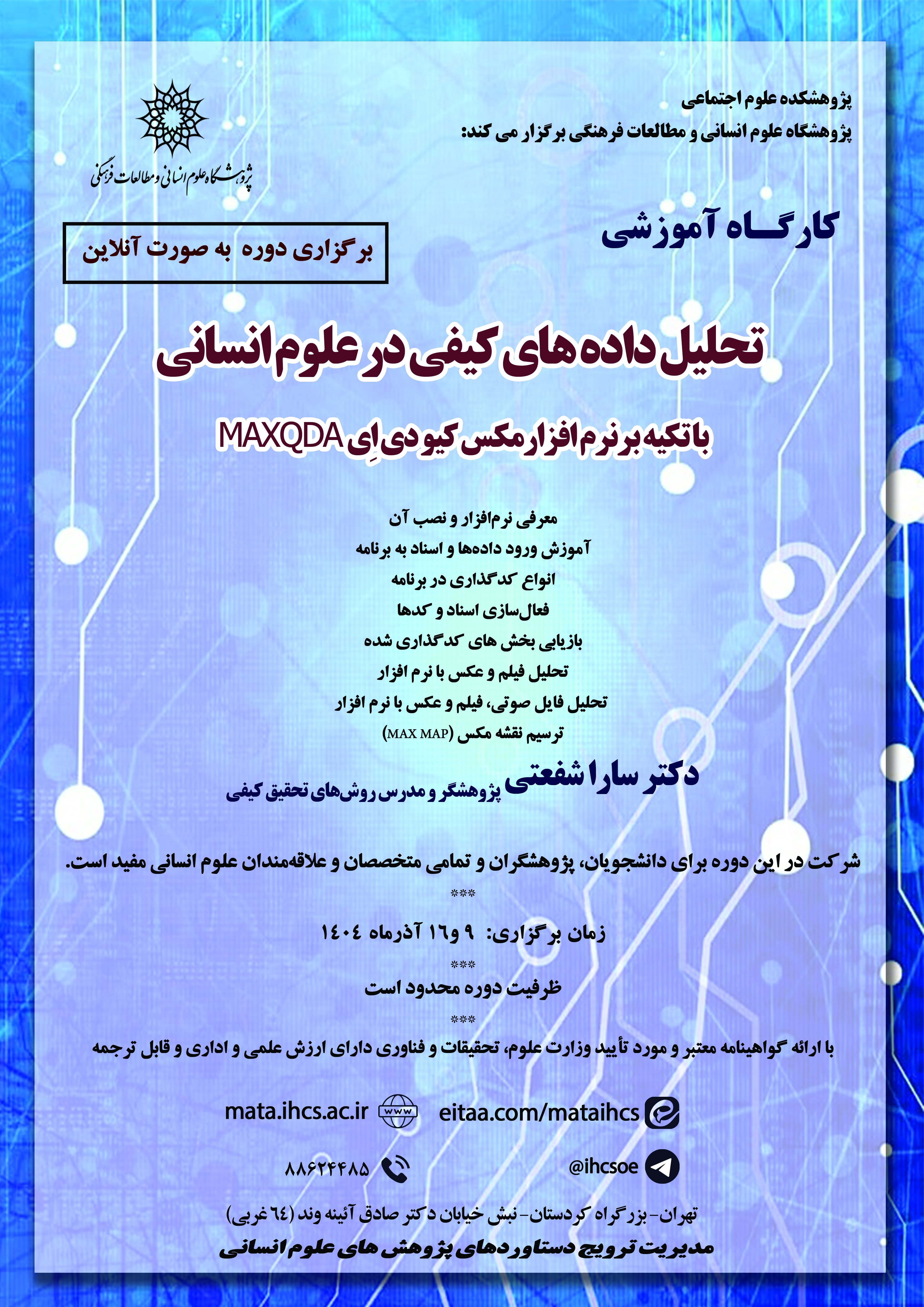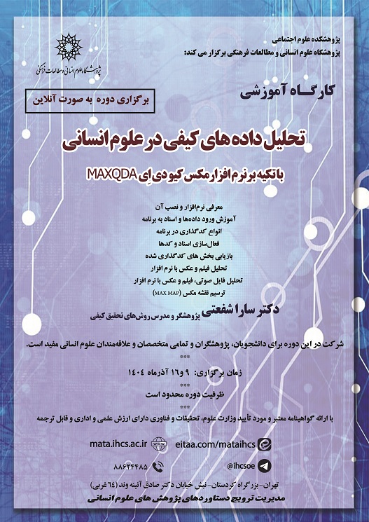 دوره آموزشی «کارگاه آشنایی با نرم افزار تحلیل داده های کیفی مکس کیو دی اِی MAXQDA» توسط مدیریت ترویج دستاوردهای پژوهش های علوم انسانی پژوهشگاه علوم انسانی و مطالعات فرهنگی در تاریخ 9و16 آذر ماه 1404 بصورت مجازی برگزار میشود.