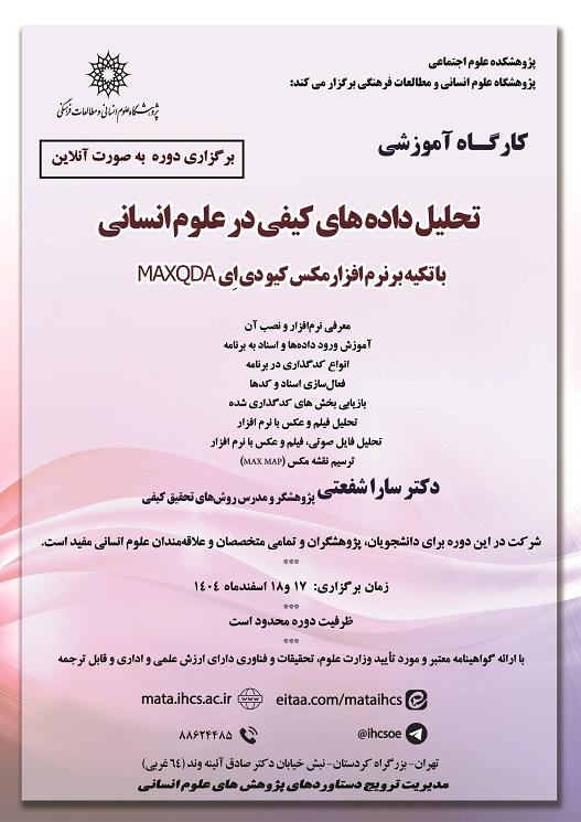 دوره آموزشی «کارگاه آشنایی با نرم افزار تحلیل داده های کیفی مکس کیو دی اِی MAXQDA» توسط مدیریت ترویج دستاوردهای پژوهش های علوم انسانی پژوهشگاه علوم انسانی و مطالعات فرهنگی در تاریخ 17و18 اسفندماه 1404 بصورت مجازی برگزار میشود.