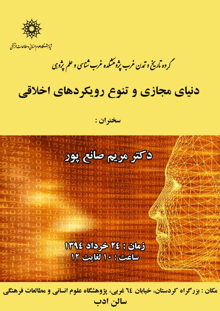 گروه تاریخ و تمدن غرب پژوهشکده غربشناسی و علم پژوهی پژوهشگاه علوم انسانی و مطالعات فرهنگی سخنرانی با عنوان دنیای مجازی و تنوع رویکردهای اخلاقی با سخنرانی دکتر مریم صانع پور برگزار می کند.