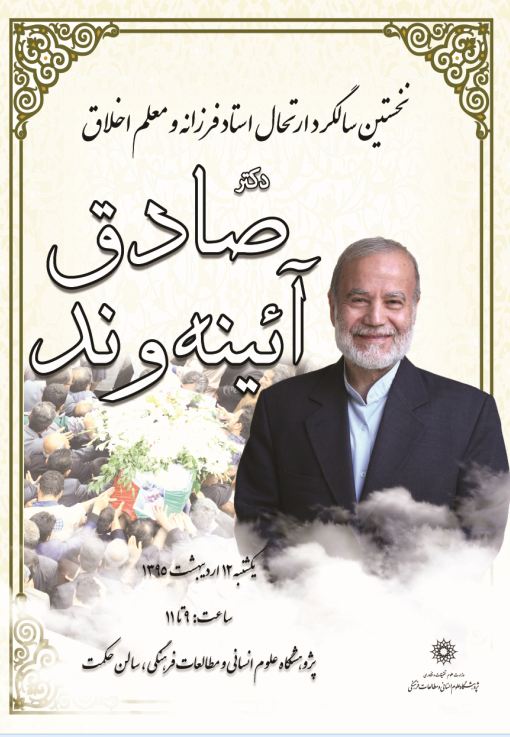نخستین سالگرد ارتحال استاد فرزانه و معلم اخلاق دکتر صادق آئینه وند در روز یکشنبه 12 اردیبهشت 1395 از ساعت 9 الی 11 در محل پژوهشگاه علوم انسانی و مطالعات فرهنگی برگزار میشود.