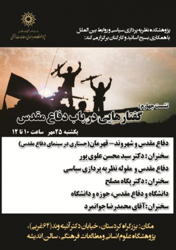"پژوهشکده نظریه پردازی سیاسی و روابط بین الملل" با همکاری "بسیج اساتید و کارکنان" نشست چهارم با عنوان گفتارهایی در باب دفاع مقدس برگزار میکند.