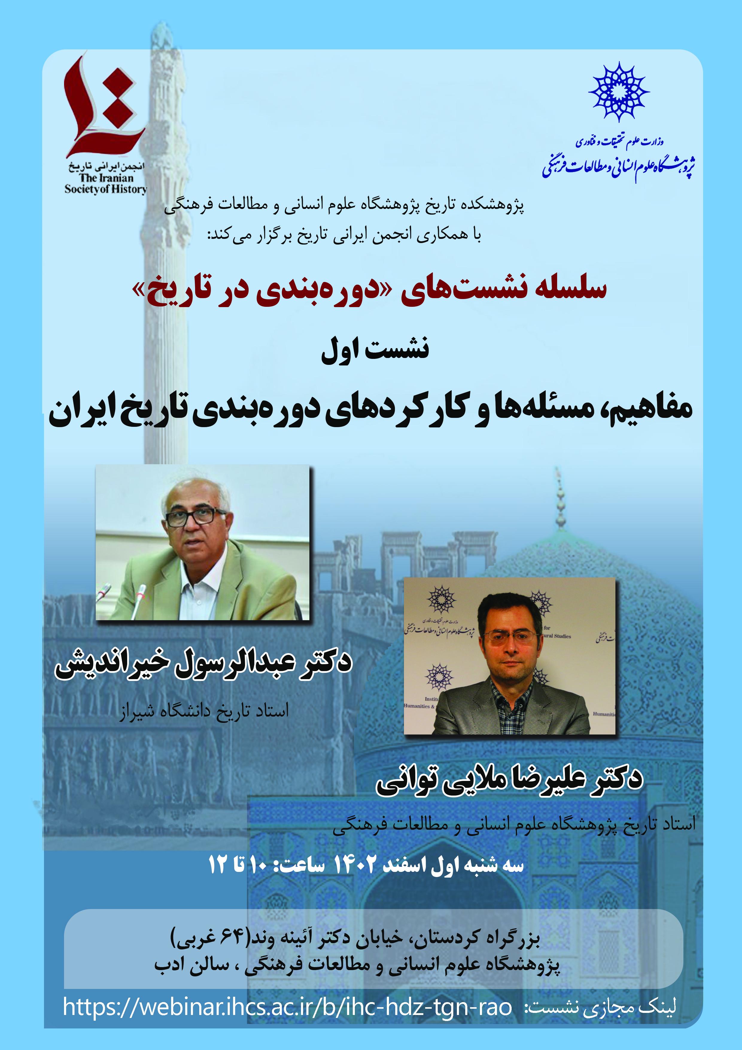 پژوهشکده تاریخ پژوهشگاه علوم انسانی و مطالعات فرهنگی با همکاری انجمن ایرانی تاریخ، نخستین نشست از سلسله نشست‌های دوره‌بندی در تاریخ را با شرح و عنوان زیر برگزار می‌کند:
