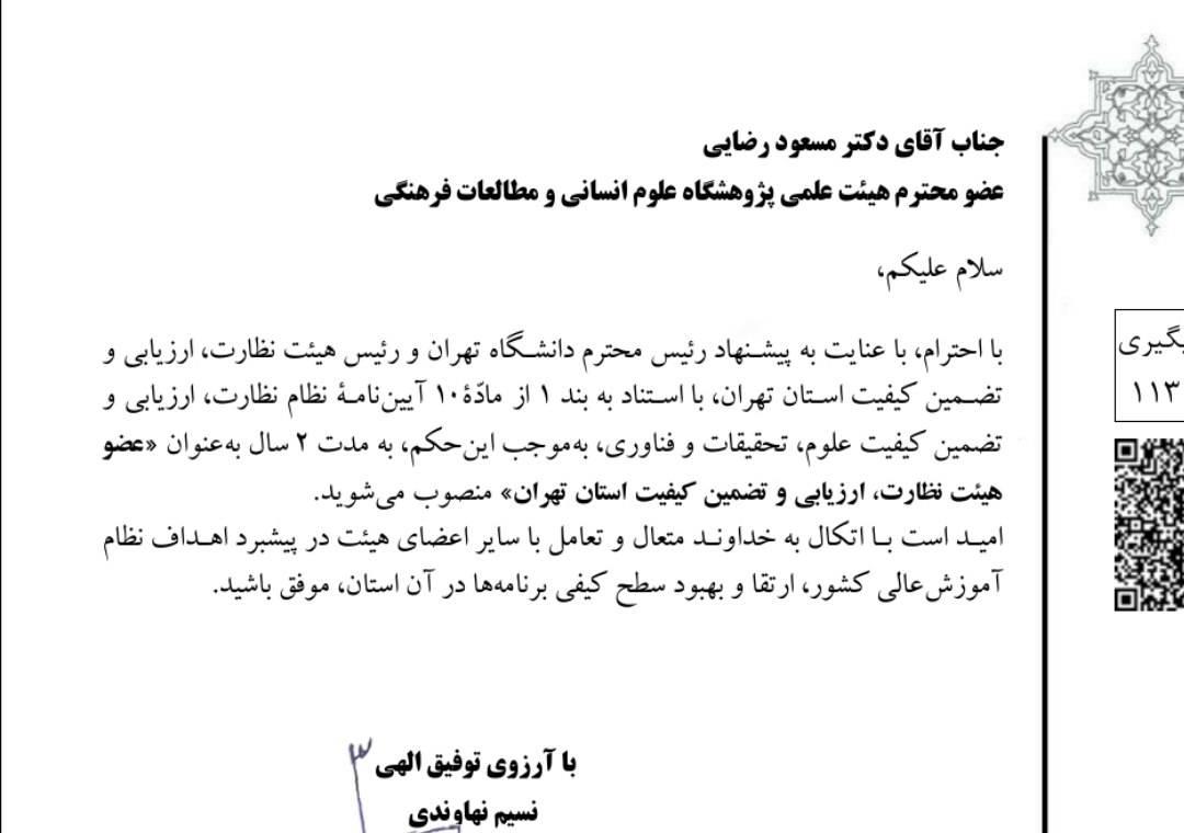 انتصاب عضو هیئت علمی پژوهشگاه علوم انسانی به عنوان عضو هیئت نظارت، ارزیابی و تضمین کیفیت استان تهران