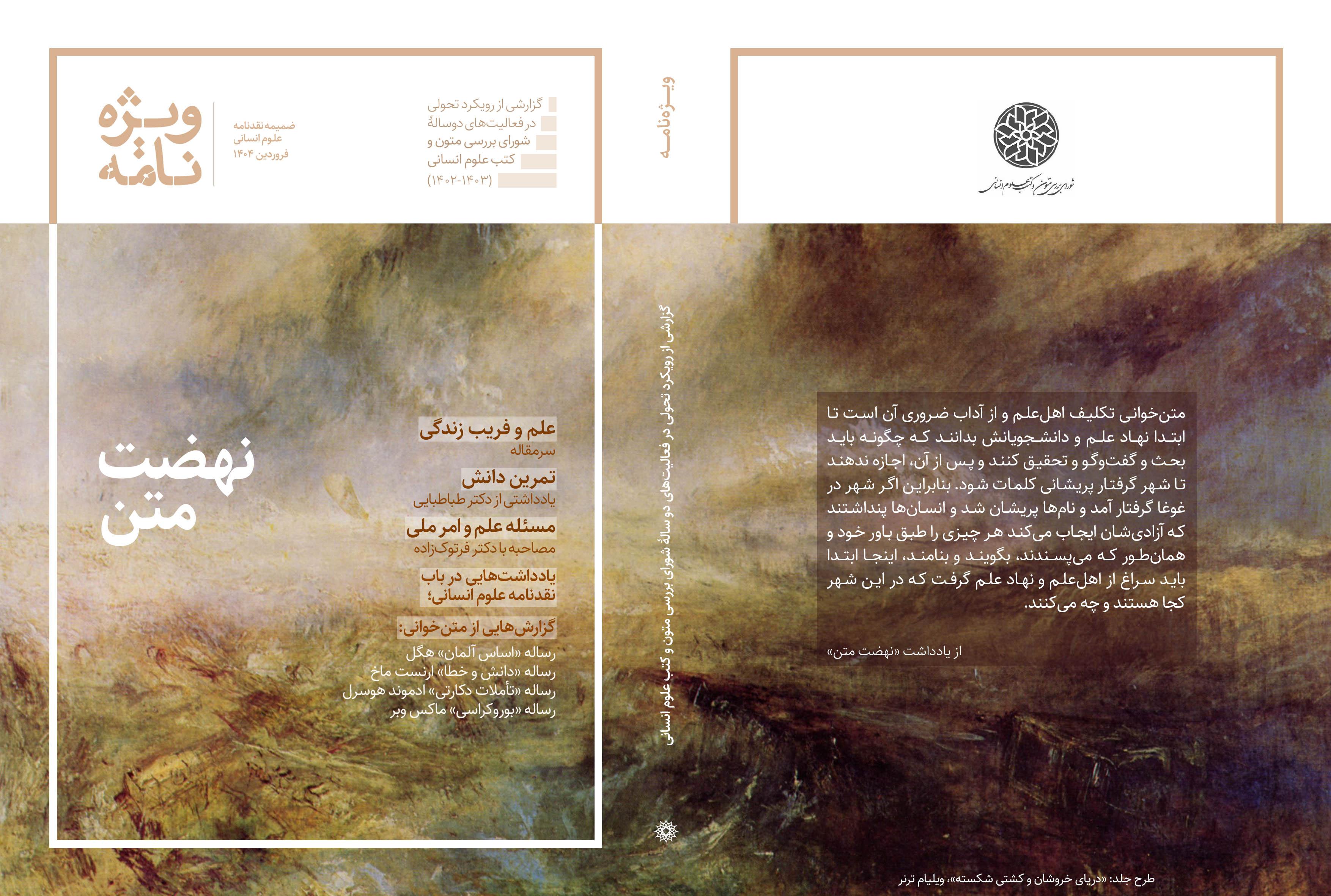 در بخش اول ویژه‌نامه، علاوه بر سرمقاله‌ای از دکتر حسن نیلی با عنوان علم و فریب زندگی و دو یادداشت از دکتر محمدتقی طباطبایی رئیس گروه فلسفه با موضوع نقد به‌سان پرورش برای دانش و دکتر اباصالح تقی‌زاده طبری دبیر گروه علوم سیاسی با عنوان متن‌خوانی چیست؟ ، مصاحبه‌ای داشته‌ایم با دکتر حمیدرضا فرتوک‌زاده رئیس گروه مدیریت شورای بررسی متون و کتب علوم انسانی با عنوان علوم انسانی و امر ملی .در ادامه گزارشی علمی آمده است از نشستی با حضور دکتر طباطبایی درباره ضرورت مراجعه به «متن‌های کلاسیک فلسفی» و گزارشی از تغییر در ساختار و رویه‌های «پژوهشنامه انتقای متون و برنامه‌های علوم انسانی».