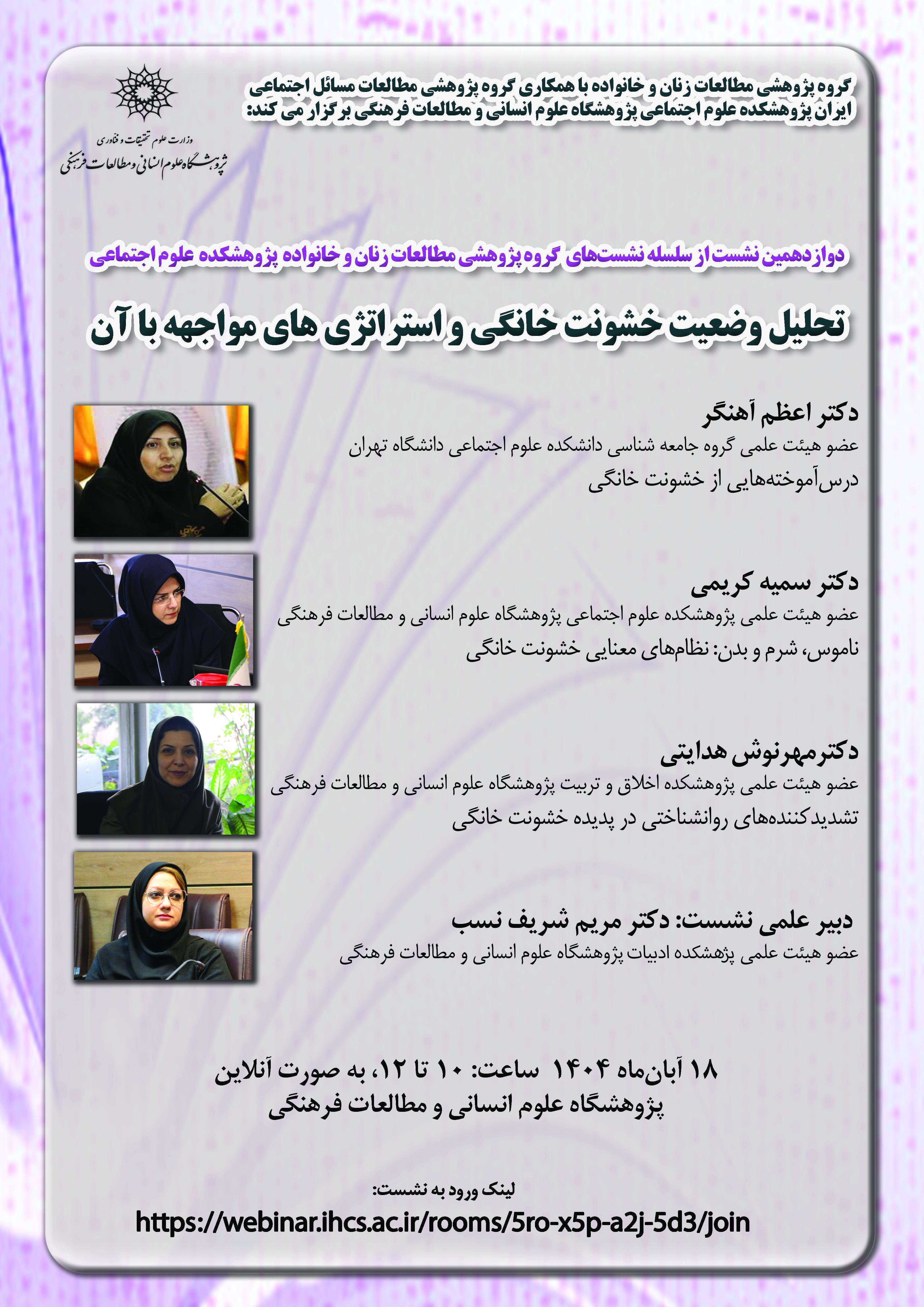 دوازدهمین نشست علمی گروه پژوهشی مطالعات زنان و خانواده با همکاری گروه پژوهشی مطالعات مسائل اجتماعی ایران پژوهشکده علوم اجتماعی با محور «تحلیل وضعیت خشونت خانگی و استراتژیهای مواجهه با آن» 18 آبانماه 1404 در پژوهشگاه علوم انسانی و مطالعات فرهنگی بهصورت مجازی برگزار شد.