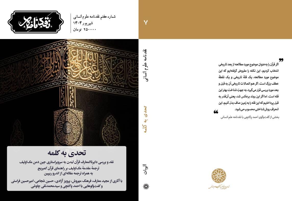 در نقدنامه هفتم (الهیات) شورای بررسی متون به بهانه توجه به دائرهالمعارف قرآن لیدن، بابی هرچند کوچک برای تحقیق درباره نسبت متن مقدس و تاریخ باز شده است و تلاش شده تا درآمدی باشد برای مرور و گاهی نقد نگاههای متنوعی که در نسبت تاریخ و متن مقدس وجود داشته است. در این شماره ترجمه مقدمه مکاولیف بر راهنمای قرآن کمبریج، و مقالهای از اندرو ریپین در آن که برای نخستین بار انجام شده و هردو نمایندگانی مهم از جریانهای مطالعات قرآنی غربی بوده و متن را در بافتار تاریخی و زبانیاش پیدا میکند.