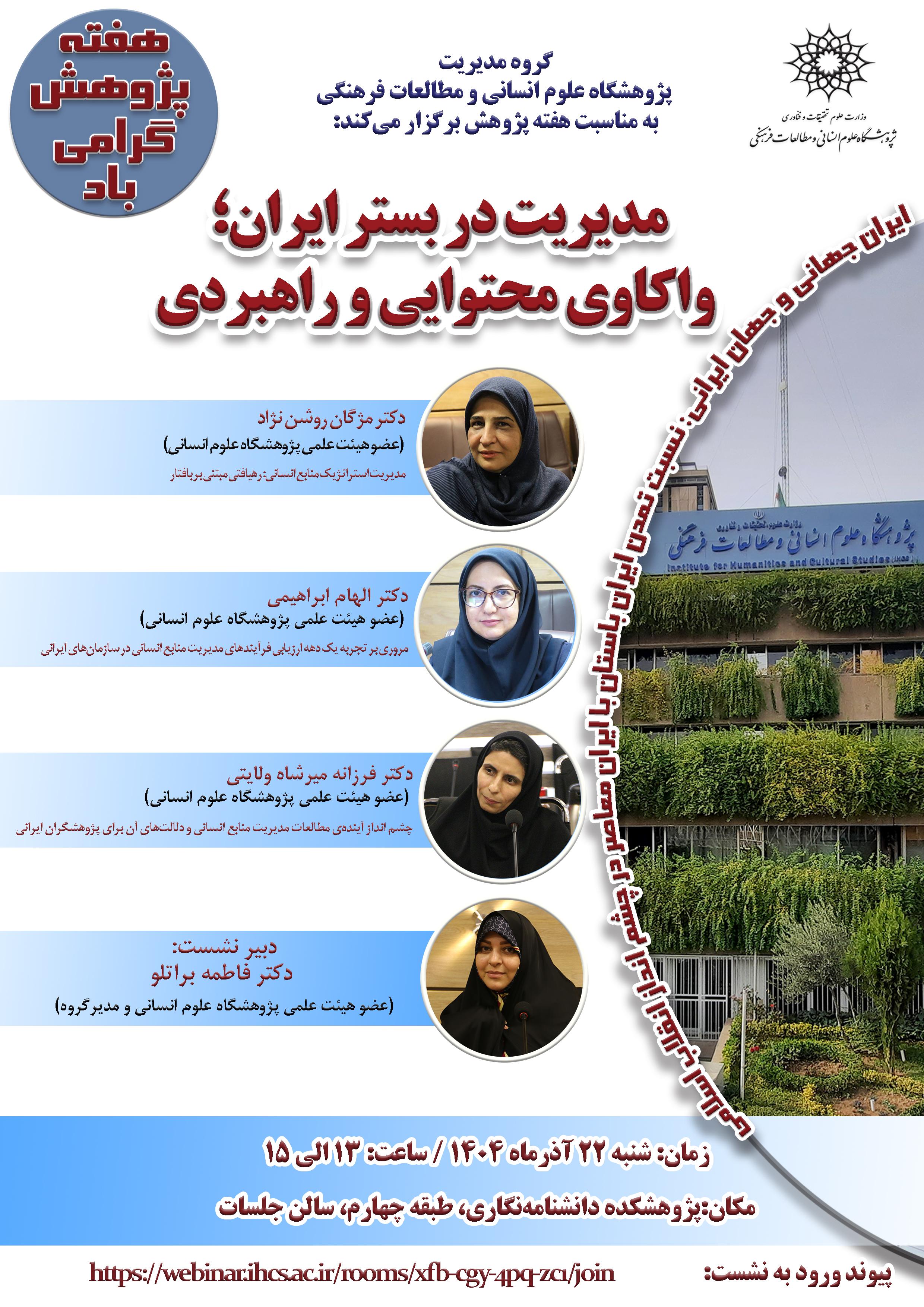 گروه مدیریتِ پژوهشگاه علوم انسانی و مطالعات فرهنگی، بهمناسبت هفته پژوهش نشستی با شرح و عنوان زیر برگزار میکند: