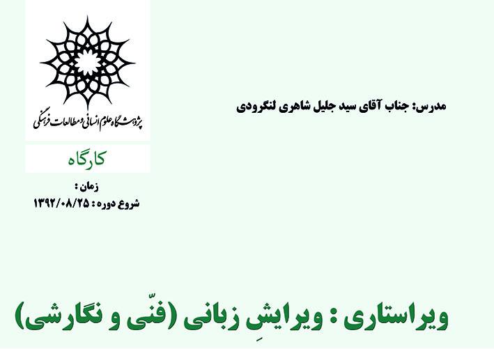 کارگاه آموزشی ویراستاری؛ ویرایشِ زبانی (فنّی و نگارشی) با تدریس سید جلیل شاهری لنگرودی در 16 جلسه دو ساعته برگزار می شود.این دوره از 22 آبان روزهای شنبه ، دوشنبه و چهارشنبه از ساعت 14:30 تا 16:30  برگزار می شود و علاقه مندان برای ثبت نام می توانند از 15 مهر تا 22 آبان اقدام کنند.